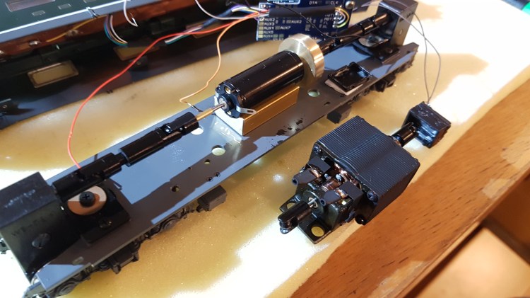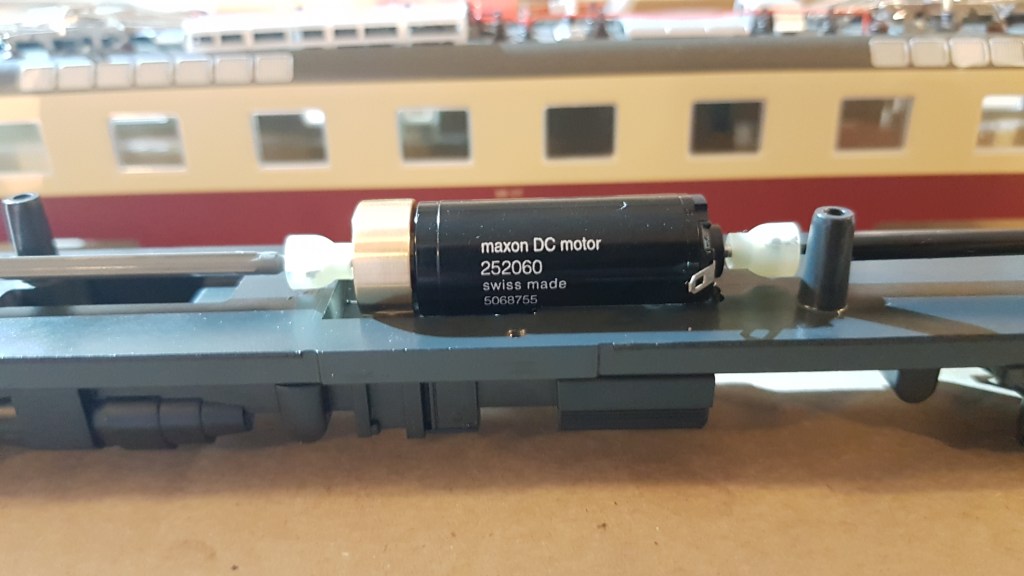 Im original Auslieferungszustand hat das Modell einen C-Sinus Softdrive Motor. Im Grunde keine schlechte Sache, nur hatte ich keinen passenden Decoder. Lokpilot 5 hat trotz Kompatibilitäts-Versprechen des Herstellers nicht zum Ziel geführt. Also habe ich auf das Umbau-Set mit Maxon-Motor zurückgegriffen.
